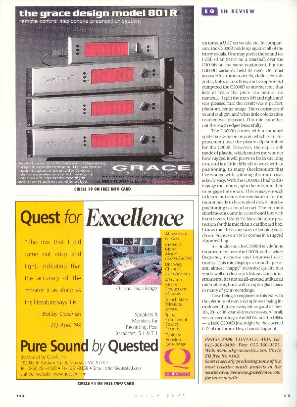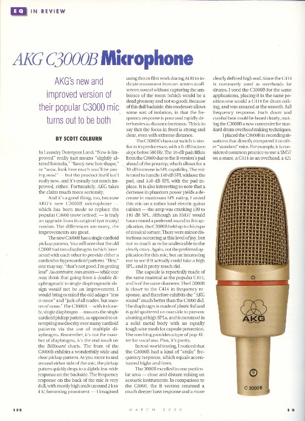The 3000B excelled in one particular area - close and distant mic’ing on acoustic instruments. In comparison to the C3000, the B version returned a much deeper bass response and a more clearly defined high end. Since the C414 is commonly used as overheads for drums, I used the C3000B for the same applications, placing it in the same position one would a C414 for drum mic’ing, and was amazed at the smooth, full frequency response! Each drum and cymbal beat could be heard clearly, making the C3000B a new contender for standard drum overhead mic’ing techniques.