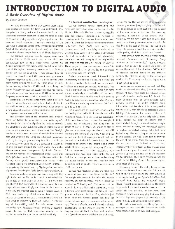 The converter looks at the amplitude of the incoming signal 44,100 times per second! The amplitude is then described using 16 digits of either ones or zeros. This 16-digit number is called a word. This stream of words is recorded onto your hard drive and is converted back into analog audio by the program you are using to edit your audio. In other words, every audio file on the computer is just series of ones and zeros grouped into 16-bit words. These audio files are refered to as uncompressed digital audio. The most popular file formats for uncompressed digital audio are .wav (Windows Audio Volume- a windows native file format), .aiff (Audio Interchange File Format- the Macintosh version of a .wav) and .sdii (Sound Designer II - proprietary file format used by Digidesign for their suite of programs such as ProTools, Sound Designer and AVID