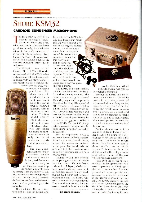 The KSM32 is a cardioid condenser mic with transformerless preamp circuitry. It has a 20" gold-layered, MylarŪ diaphragm which is pruposrted to handle spl's up to 133db which a frequncy range of 20-20kHz.
