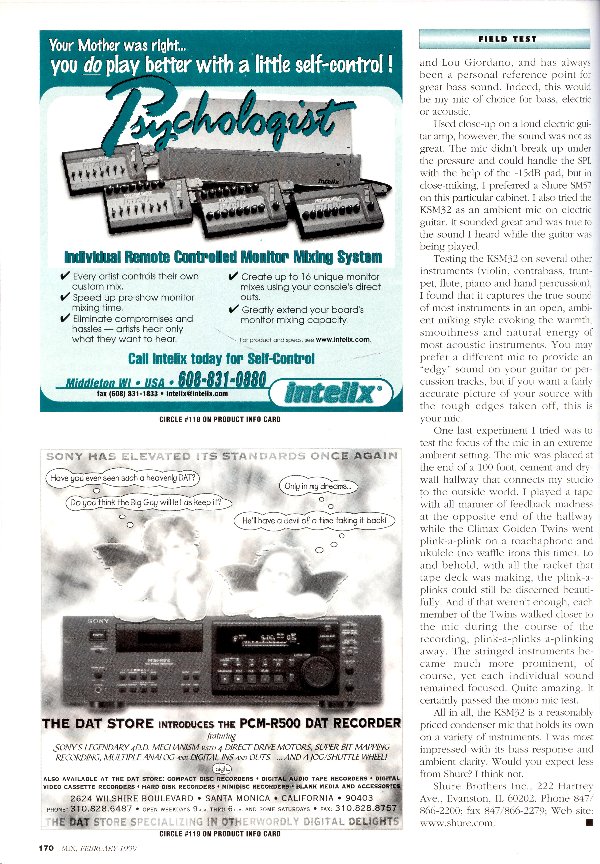 The booklet mentions several different applications of thsi mic, mainly voice, acoustic instruments adn ambient mic techiniques like overheads for drum kit. It w\also mentions low frequency instruments like Bass or Kick Drum. "What's that? A mic that sounds good on a kick and on a voice? Prove it." I was a little worried abiout putting a mic of this calibre in a kick drum so I yelled, "Don't look Ethyl!" It was too late, she'd already got a free shot. Luckily, this mic comes with a -15db pad switch right on the back of the mic. I compared to to the D112 and although I think I'll stick with teh D112 for kick, the KSM32 kicked ass in the low end department. Teh kick was round, fat adn moved considerable air on the sub woofer. Onl;y time will tell if the diaphragm will hold up to repeated punishment.
