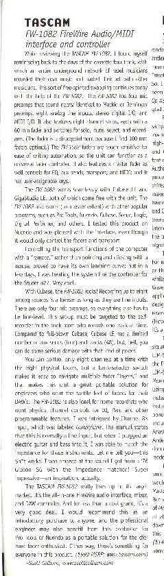 The 1082 arrives with Cubase LE and GigaStudio. You may think that these are the suggested programs that should be used for this controller and in fact, you’d be correct, but it also works (to a lesser extent) with other popular programs like ProTools, Nuendo, Sonar and others. I tested this on Nueundo and it was definitely a welcomed interface even though it would only control the faders and transport. It took a little bit of getting use to controlling the transport functions of the computer with a “remote” rather than pointing and clicking but in a few days, I was treating it like the controller for the Studer 827. Now that was cool.